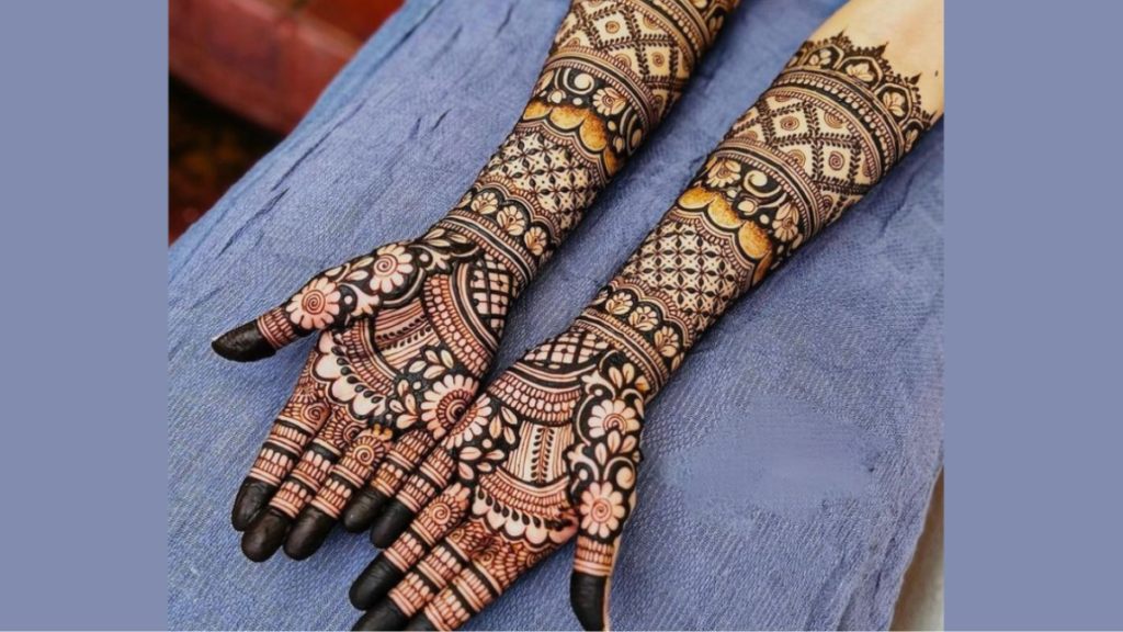 पूरी हथेली और बाजू को कवर करने वाला यह डिज़ाइन बेहद डिटेलिंग के साथ बनाया जाता है। शादी और खास मौकों के लिए यह सबसे ज्यादा पसंद किया जाता है1.