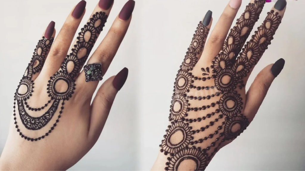इसमें कलाई से उंगलियों तक चेन जैसी लाइनें और डॉट्स बनाए जाते हैं। यह डिजाइन मॉडर्न और यूनिक लुक के लिए पसंद किया जाता है1.