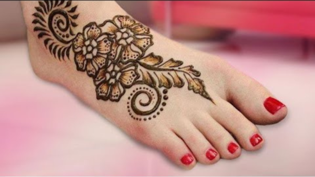 फूलों की बेलें दोनों हाथों की उंगलियों से कलाई तक जुड़ती हुई दिखाई देती हैं।