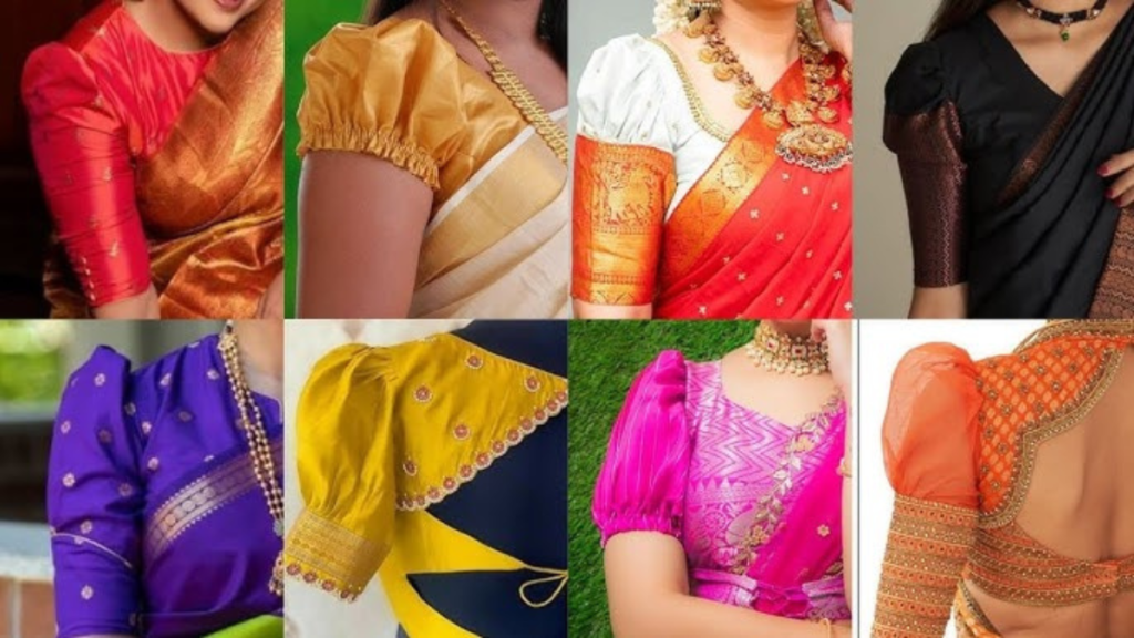 पैफ स्लीव वाला ब्लाउज एक प्लेफुल और स्टाइलिश विकल्प है जो पारंपरिक शादी रंगों के साथ भी बहुत सूट करता है।