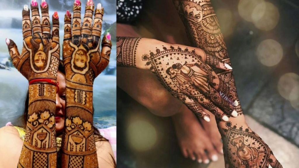 हाथों पर दुल्हा-दुल्हन की तस्वीरें बनवाना 2024 में बेहद लोकप्रिय है। इसमें प्यार और साथ का प्रतीक भी झलकता है।
