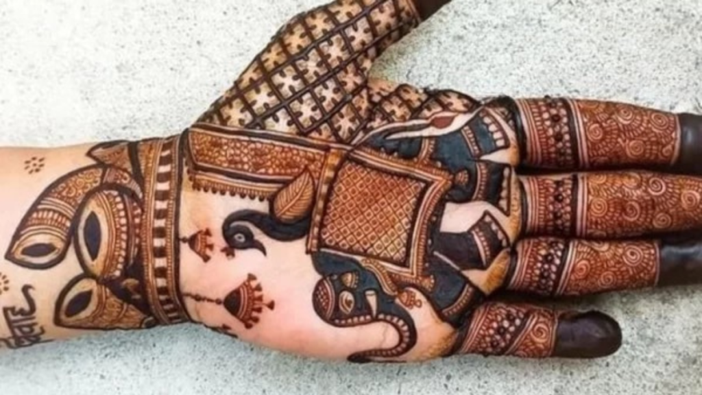 हाथों पर हाथी और मोर की आकृतियाँ शुभता और सुंदरता का प्रतीक हैं। यह डिज़ाइन पारंपरिकता के साथ-साथ यूनिकनेस भी लाती है।