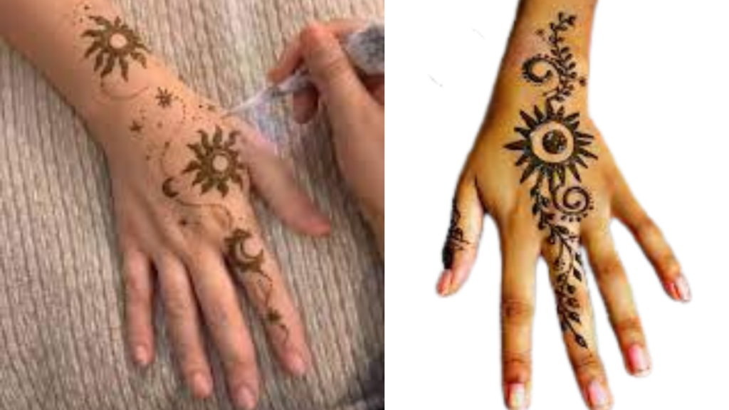 सूरज की आकृति बच्चों के लिए आकर्षक और सरल है। इसे हथेली के बीच में बनाना अच्छा लगता है।