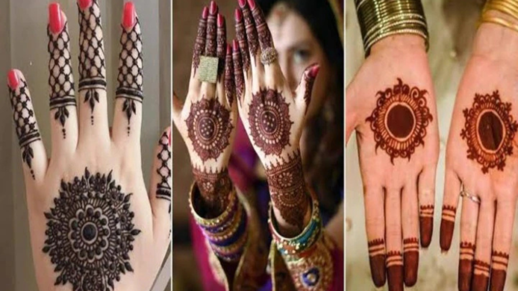हथेली के बीच में गोल टिक्की और उसके चारों ओर छोटे पैटर्न इसे खास बनाते हैं। यह पारंपरिक और सरल दोनों है।