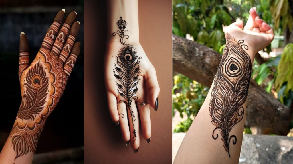 मोर के पंखों से प्रेरित यह डिज़ाइन हाथों को रॉयल लुक देता है। इसे बनाना आसान है और यह हर उम्र के लिए उपयुक्त है।