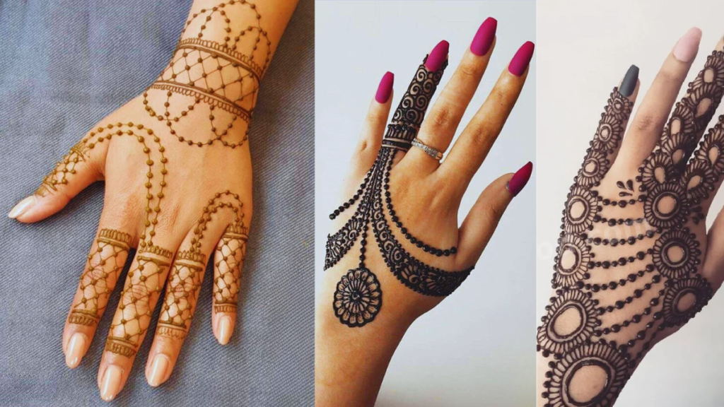 यह डिज़ाइन पारंपरिक और आधुनिक पैटर्न का सुंदर मिश्रण है, जिसे कोई भी आसानी से बना सकता है। सरल रेखाओं और फूलों के मोटिफ़ से यह आपके हाथों को खास अवसरों पर और भी आकर्षक बना देता है।