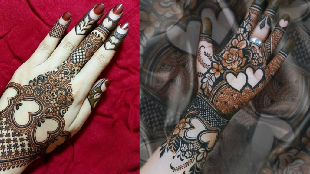दिल के आकार की मेहंदी युवाओं में बहुत लोकप्रिय है। यह सिंपल और प्यारी लगती है, खासकर फेस्टिवल्स के लिए।