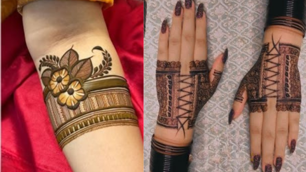कलाई या उंगलियों पर बैंड की तरह सीधी लाइन बनाएं और उसमें छोटे-छोटे पैटर्न जोड़ें। यह डिजाइन हर मौके के लिए परफेक्ट है।
