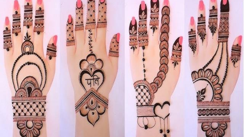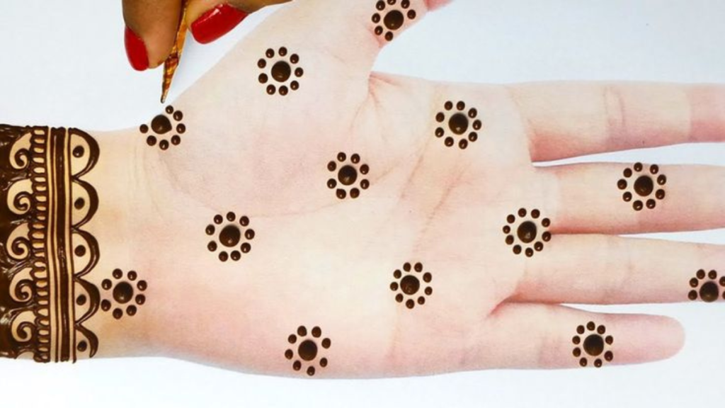 हथेली के बीच में छोटा सा हार्ट बनाएं और उसके चारों ओर डॉट्स या पत्तियां जोड़ें। यह डिज़ाइन खास मौकों के लिए परफेक्ट है।