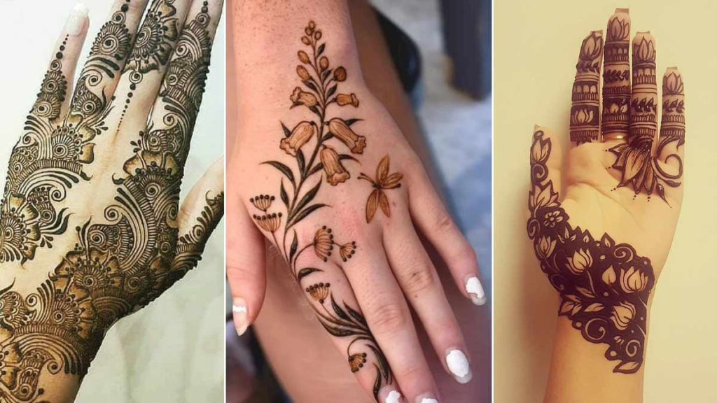 कलाई से उंगलियों तक बहती हुई बेल और फूलों का पैटर्न बनाएं। यह बोल्ड और स्पेस्ड-आउट डिज़ाइन है, जिससे बनाना आसान है।