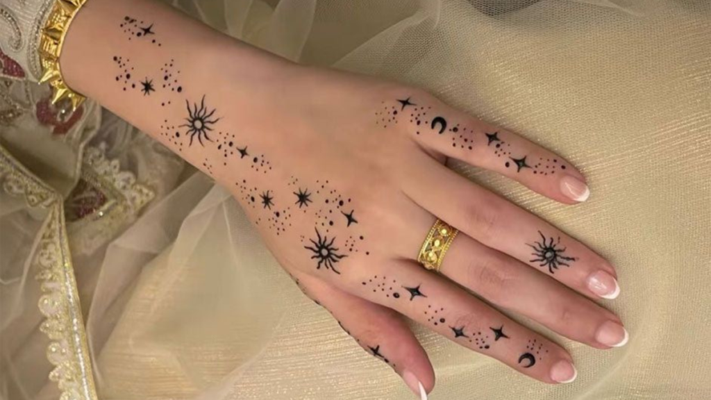 हथेली पर छोटा सा चाँद और उसके पास तारे बनाएं। यह डिज़ाइन बेहद सिंपल है और त्योहारों के लिए खास पसंद किया जाता है।