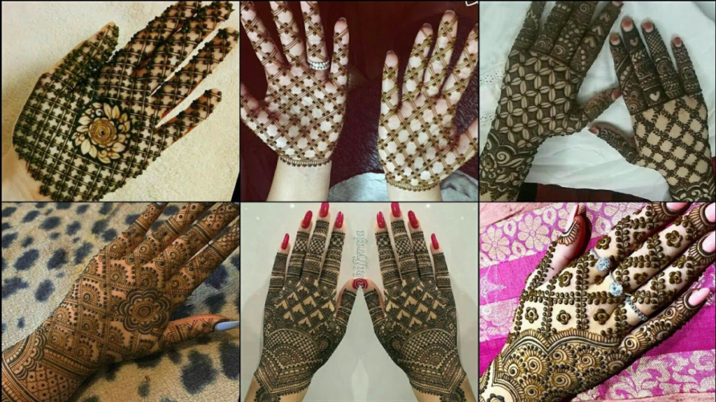 जियोमेट्रिक लाइनें और क्रिस-क्रॉस पैटर्न हाथों को मॉडर्न लुक देते हैं। यह सिंपल और स्टाइलिश डिज़ाइन है।