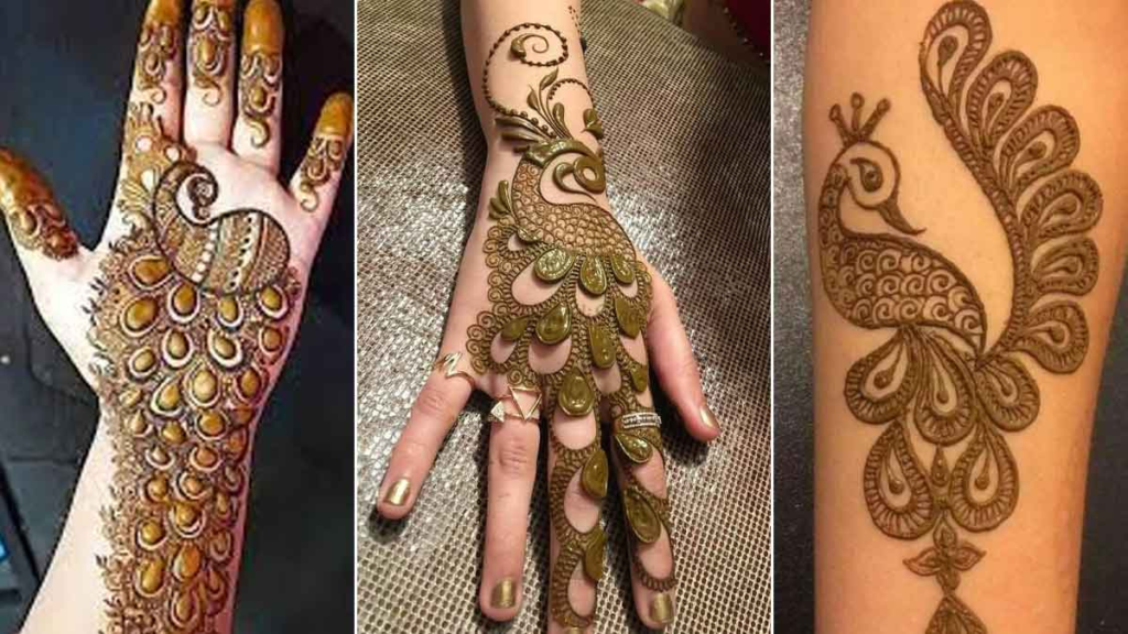 मोर के पंखों की आकृति से सजे पैटर्न हाथों को आकर्षक बनाते हैं। यह पारंपरिक और ट्रेंडी दोनों है।