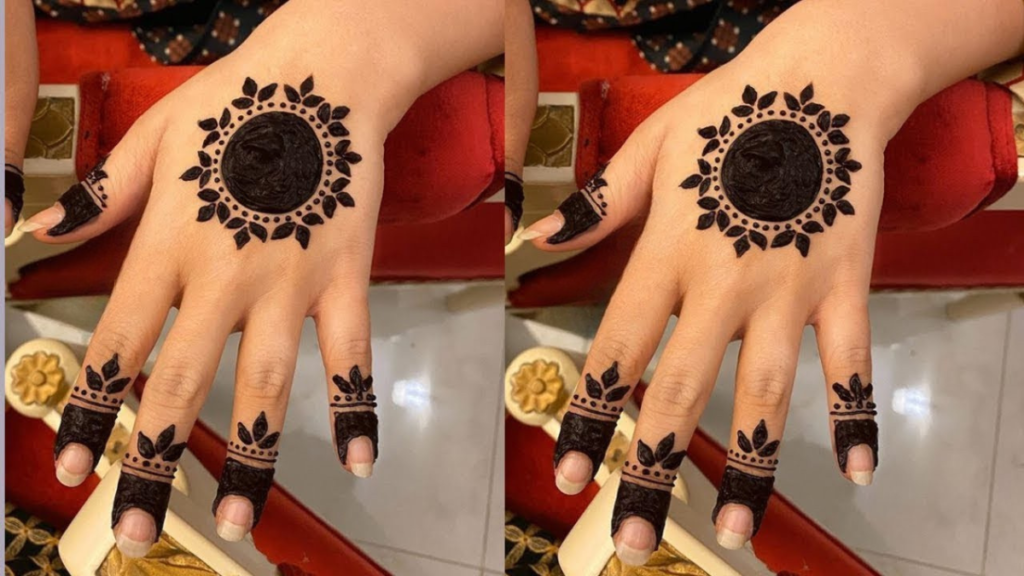 हथेली के बीच में गोल टिक्की और उसके चारों ओर छोटे-छोटे पैटर्न बनाए जाते हैं, जो सादगी में सुंदरता लाते हैं।