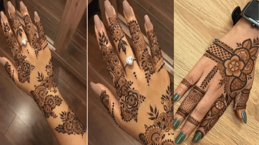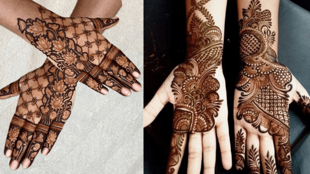 यह डिज़ाइन हाथों को देता है एक आकर्षक और पारंपरिक लुक, जिसमें फूलों की बारीकी और बेलों की कलाकारी शामिल है।