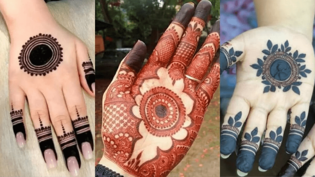 हथेली के बीच में गोल टिकली और उसके चारों ओर फूलों की सजावट एक पारंपरिक और आकर्षक लुक देती है। त्योहारों के लिए बेस्ट।