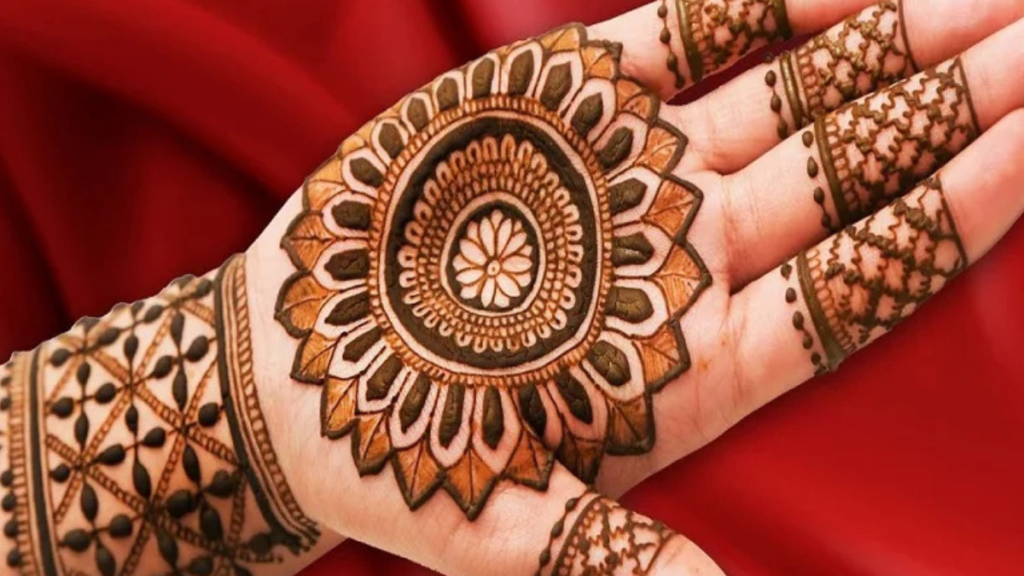 हथेली के बीच में मंडला बनाएं और किनारों पर हल्के डिटेल्स जोड़ें।