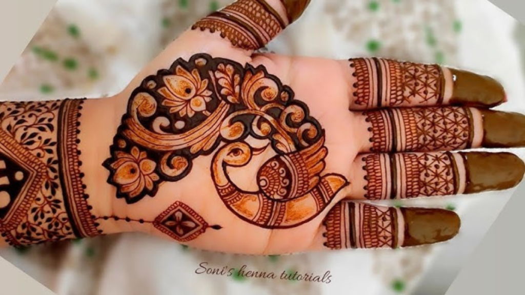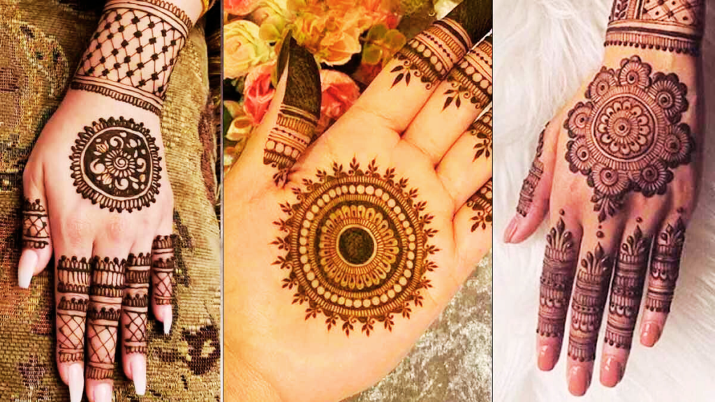यह डिज़ाइन हाथ के बीच में गोल आकार बनाकर सिंपल और ट्रेडिशनल लुक देता है। त्योहारों और छोटी पार्टियों के लिए परफेक्ट है।