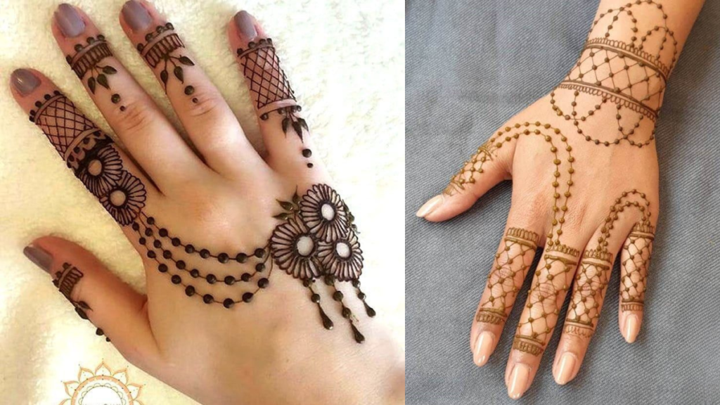 हाथों पर चेन जैसी लड़ी बनाकर सिंपल और यूनिक डिजाइन मिलता है।