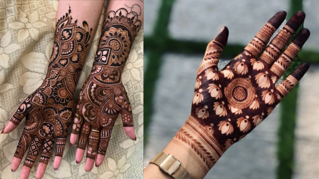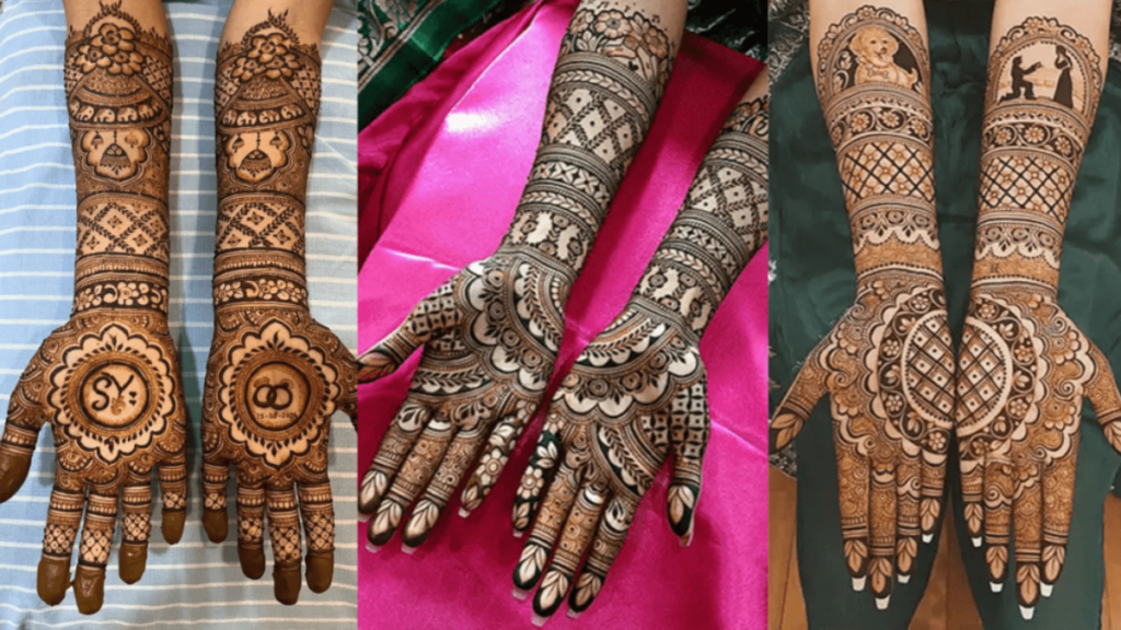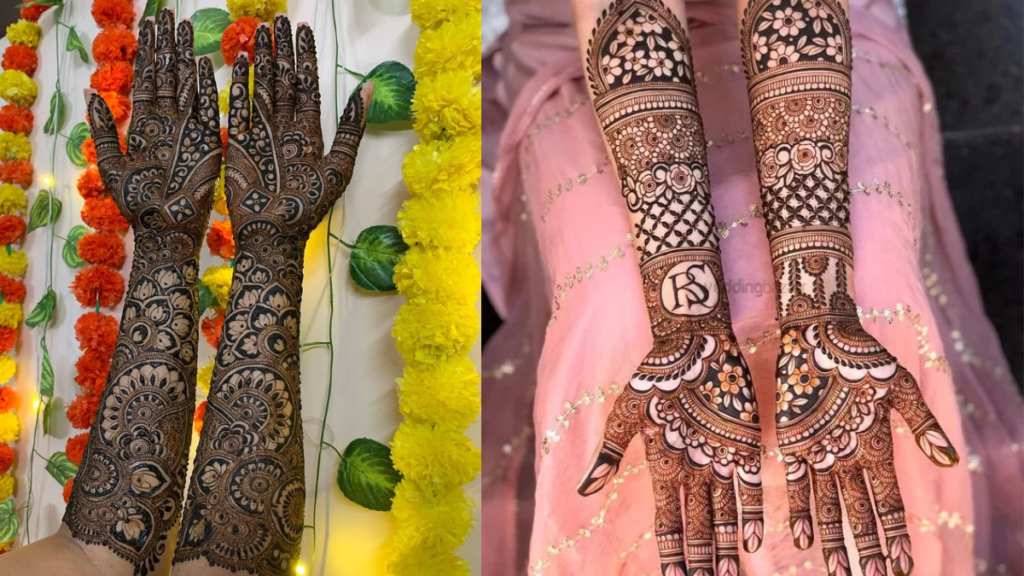 इस साल फुल हैंड ब्राइडल मेहंदी डिज़ाइन खास ट्रेंड में हैं, जिसमें दूल्हे का नाम, दिल के आकार और फूलों की नाजुक बेलों से हाथों को सजाया जाता है। यह डिज़ाइन न सिर्फ सुंदरता बढ़ाते हैं, बल्कि दुल्हन की भावनाओं को भी दर्शाते हैं।
