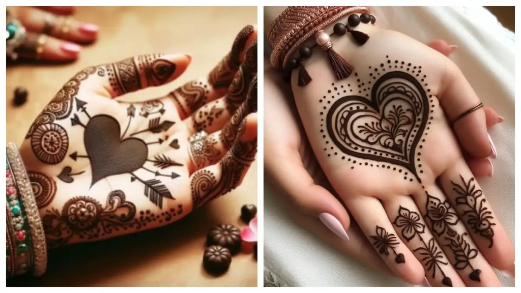 हथेली के बीच में हार्ट शेप बनाएं और उसके चारों ओर डॉट्स या पत्तियां जोड़ें। यह रोमांटिक और प्यारा लगता है।