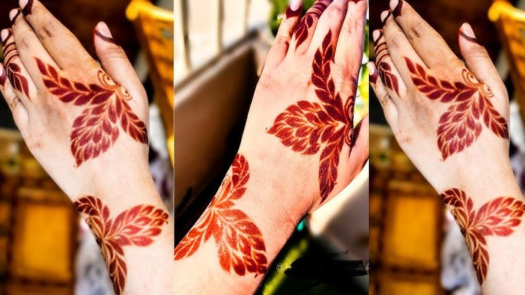 हथेली पर छोटे-छोटे फूल और पत्तियों का सिंपल पैटर्न बनाएं। यह डिज़ाइन जल्दी बन जाता है और सुंदर दिखता है।