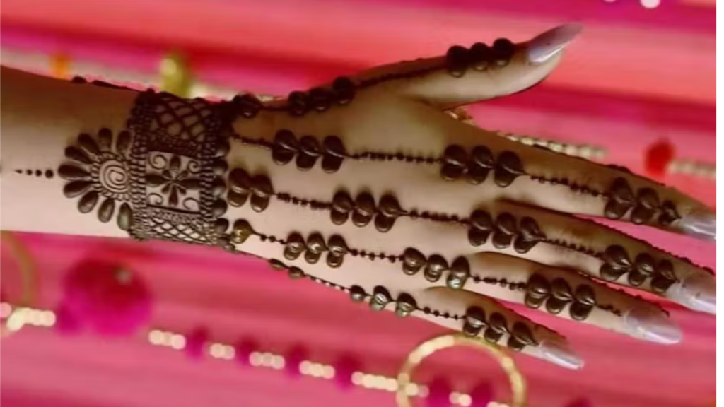 हथेली पर जाल जैसा पैटर्न बनाएं और बीच-बीच में डॉट्स या छोटे फूल जोड़ें। यह सिंपल और क्लासी है।